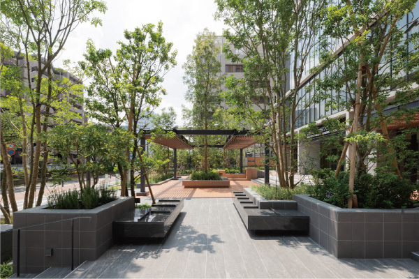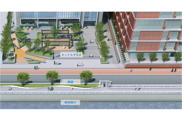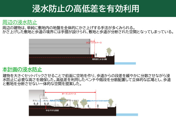 近年の気候変動により、各地で大雨に起因する水害が多発している。建物内への浸水を防ごうとすると、街との境界部分に擁壁等が立ち上がり、街との連続性が失われてしまうという課題がある。本プロジェクトは、川に面する側に奥行きのある広場(キャナルテラス)を設け、微地形によって緩やかに川側道路と敷地をつなげることで、浸水対策と居場所の創出の両立を試みたものであり、非日常と日常を繋ぐデザインとして、高く評価できる。広場には木陰を作る樹木や居場所となるベンチが配置され、テラスに面した部分にカフェを設けるなど、街に賑わいをもたらす工夫がなされている。貫通通路を設けることで裏側道路からのアクセス性にも配慮されており、地域に貢献する優れたプロジェクトである。