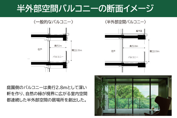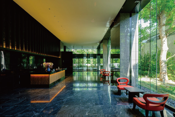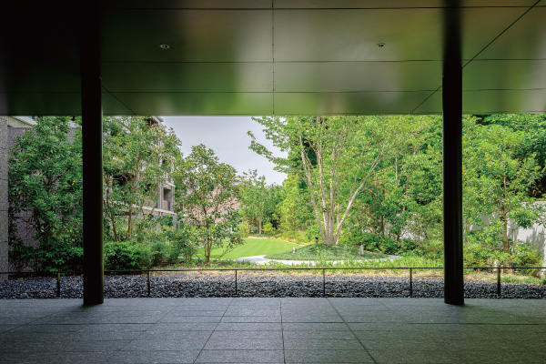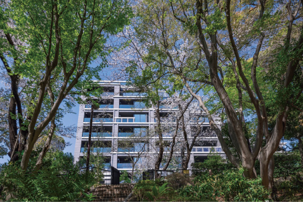 一面が道路、一面が庭園という恵まれた立地特性を最大限に生かした集合住宅である。特に庭園側に設けられたバルコニーは、扁平梁などの構造的な工夫やゆとりある奥行きの効果もあって、集合住宅とは思えない「外の部屋」とも呼べる空間となっている。さらに敷地内に施されたランドスケープデザインやアプローチの半屋外空間、緑に包まれたエントランスホールなどが連携し、どこにいても都心とは思えないほど豊かな自然環境を享受できる場となっている。敷地の文脈を生かすという設計の基本に誠実に取り組んだからこそ生まれた豊かさである。