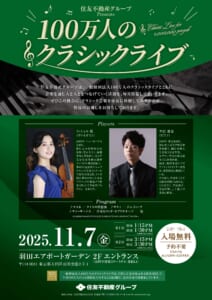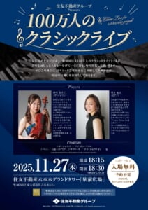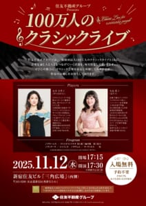住友不動産グループは、一般財団法人100万人のクラシックライブとともに、プロの演奏家による本格的なクラシック音楽を間近に楽しめる「住友不動産グループ presents 100万人のクラシックライブ」を、下記3箇所の当社施設において2024年4月より毎月開催しております。