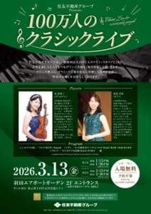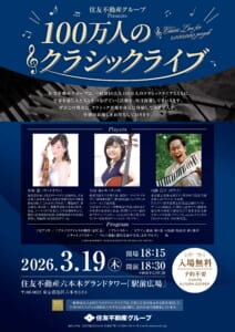 住友不動産グループは、一般財団法人100万人のクラシックライブとともに、プロの演奏家による本格的なクラシック音楽を間近に楽しめる「住友不動産グループ presents 100万人のクラシックライブ」を、下記3箇所の当社施設において2024年4月より毎月開催しております。