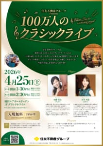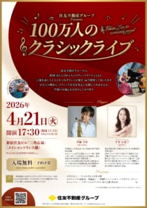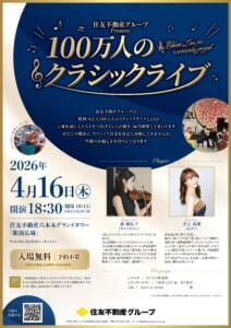 住友不動産グループは、一般財団法人100万人のクラシックライブとともに、プロの演奏家による本格的なクラシック音楽を間近に楽しめる「住友不動産グループ presents 100万人のクラシックライブ」を、下記3箇所の当社施設において2024年4月より毎月開催しております。